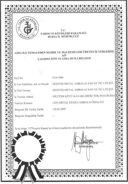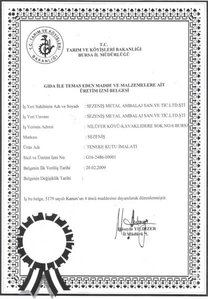 SERTİFİKALARIMIZ - Sezeniş Teneke Kutu Ambalaj Sanayi Faaliyetine 1947 yılında başlayan firmamız, sektöründe Türkiye’nin önde gelen ambalaj üreticileri arasındadır. İşlemede gıda, sanayi ve genel amaçlı olmak üzere baskılı ve baskısız, yuvarlak, dörtköşe ve özel teneke ambalajları üretilmektedir. sertİfİkalarimiz, sezeniş, ambalaj, teneke, kutu, silindirik, kutular, metal, fıçı, yuvarlak, köşeli, gıda, kutuları